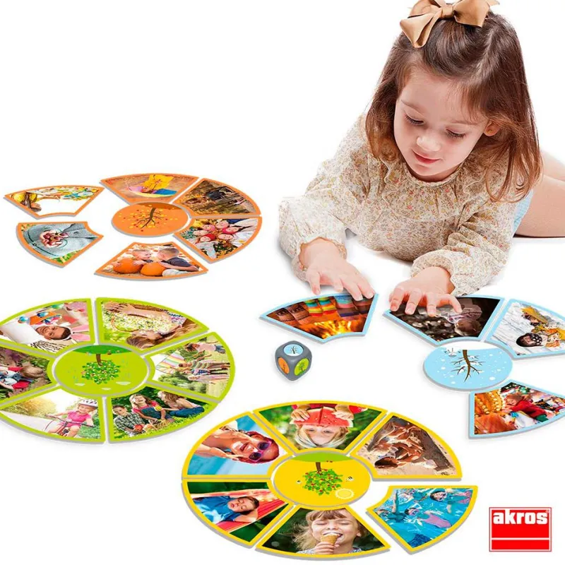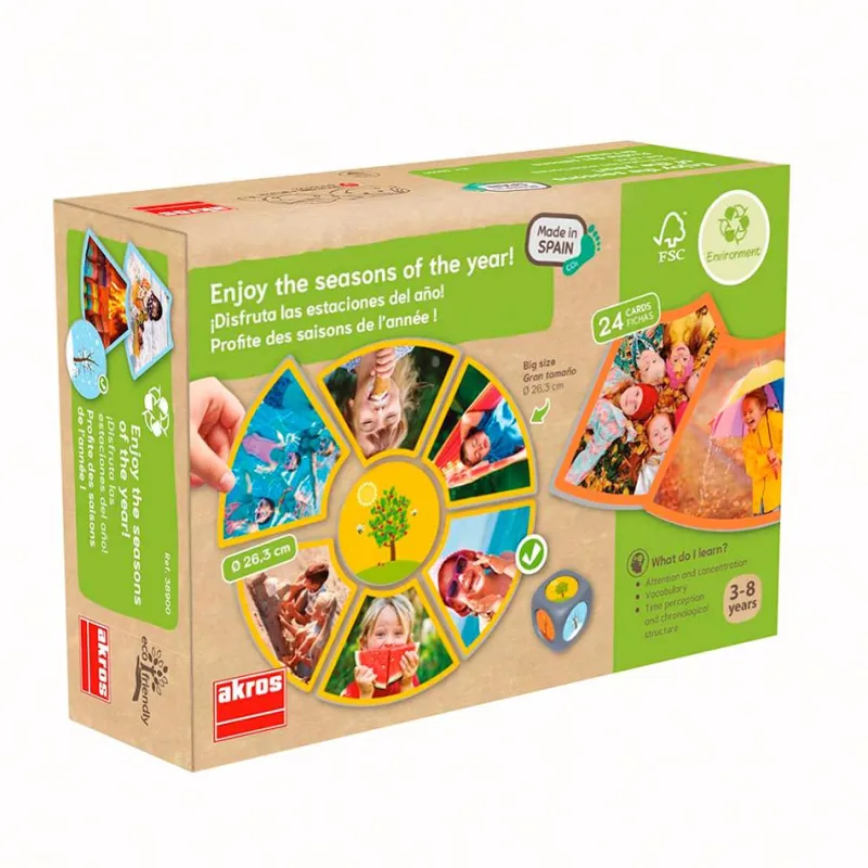 Es un original juego que nos permitirá aprender las estaciones del año y las actividades características que se pueden realizar en cada una de ellas, estimular la atención, la concentración, la percepción temporal y la estructura cronológica. El material de las fichas es ecológico, proveniente de bosques sostenibles y 100% reciclable.