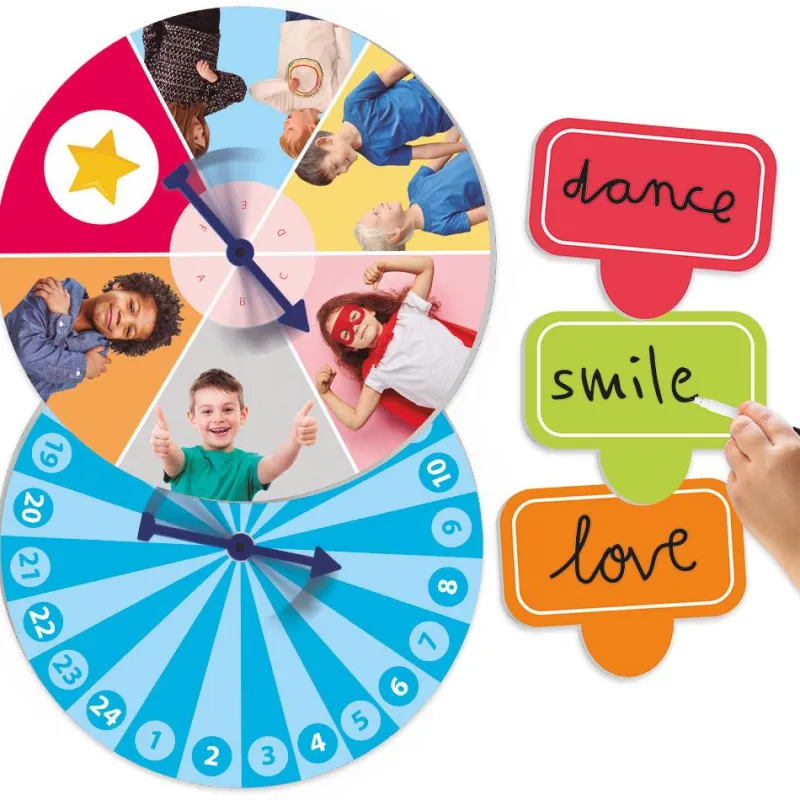 Gira la ruleta y observad quién será el protagonista en ese turno y qué acción habrá que llevar a cabo, ¡son de lo más divertido! Expresar las cualidades que vemos en otros, cosquillas, choque de codos… En ocasiones será todo el grupo el que lleve a cabo la acción para el protagonista, y en otras será uno solo.