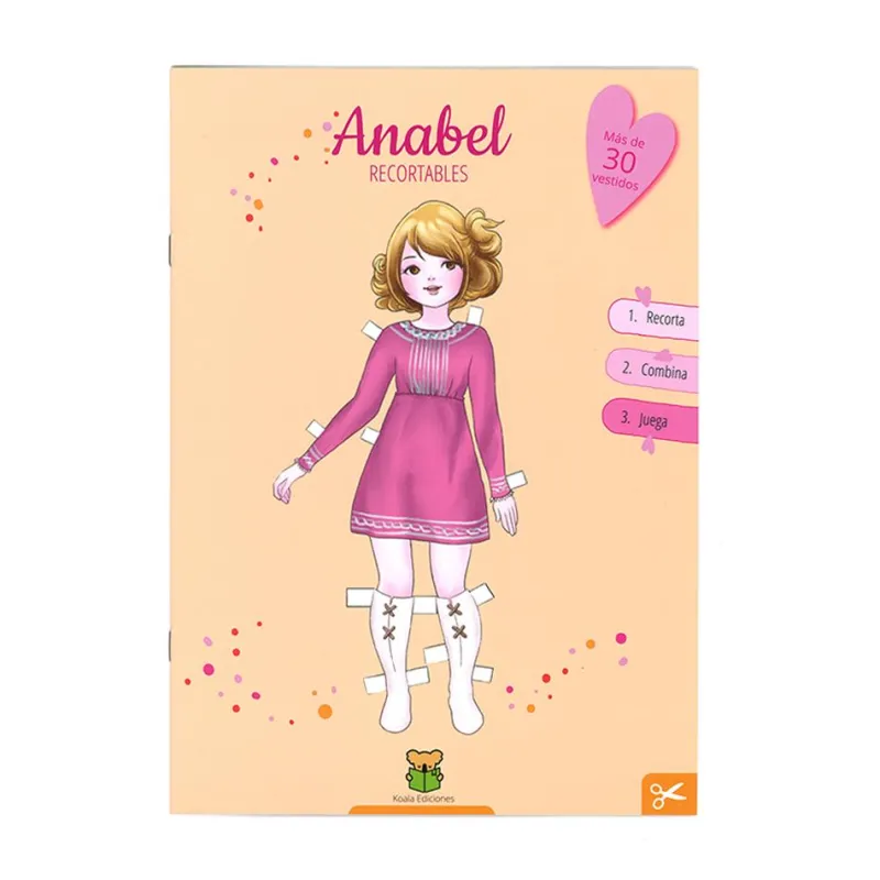 Dentro del libro encontrarás a Anabel, sus vestidos y sus complementos. Recórtalos con tus tijeras y comienza a jugar. Ayuda a Anabel a elegir qué ponerse hoy para que luzca con el máximo estilo!