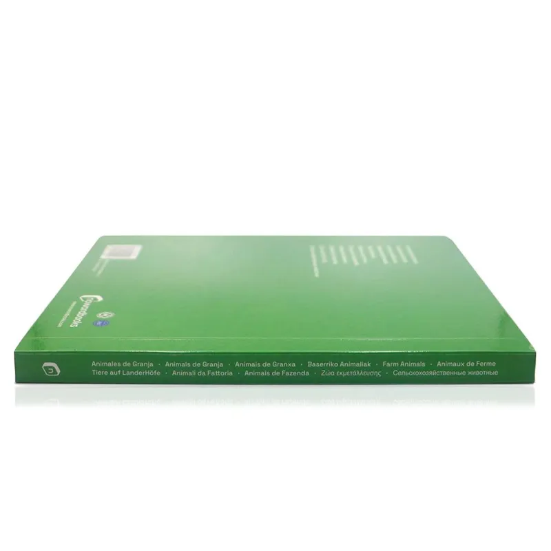 Libro con fotografías de animales que habitan en las granjas. Con varias fotografías de cada animal distribuidas a doble página.