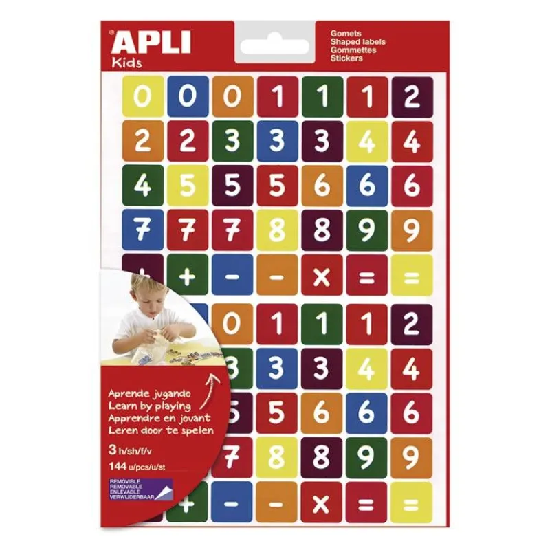 Incluye 3 hojas de gomets removibles, con numeración del 0 al 9 y los signos ( – x =).