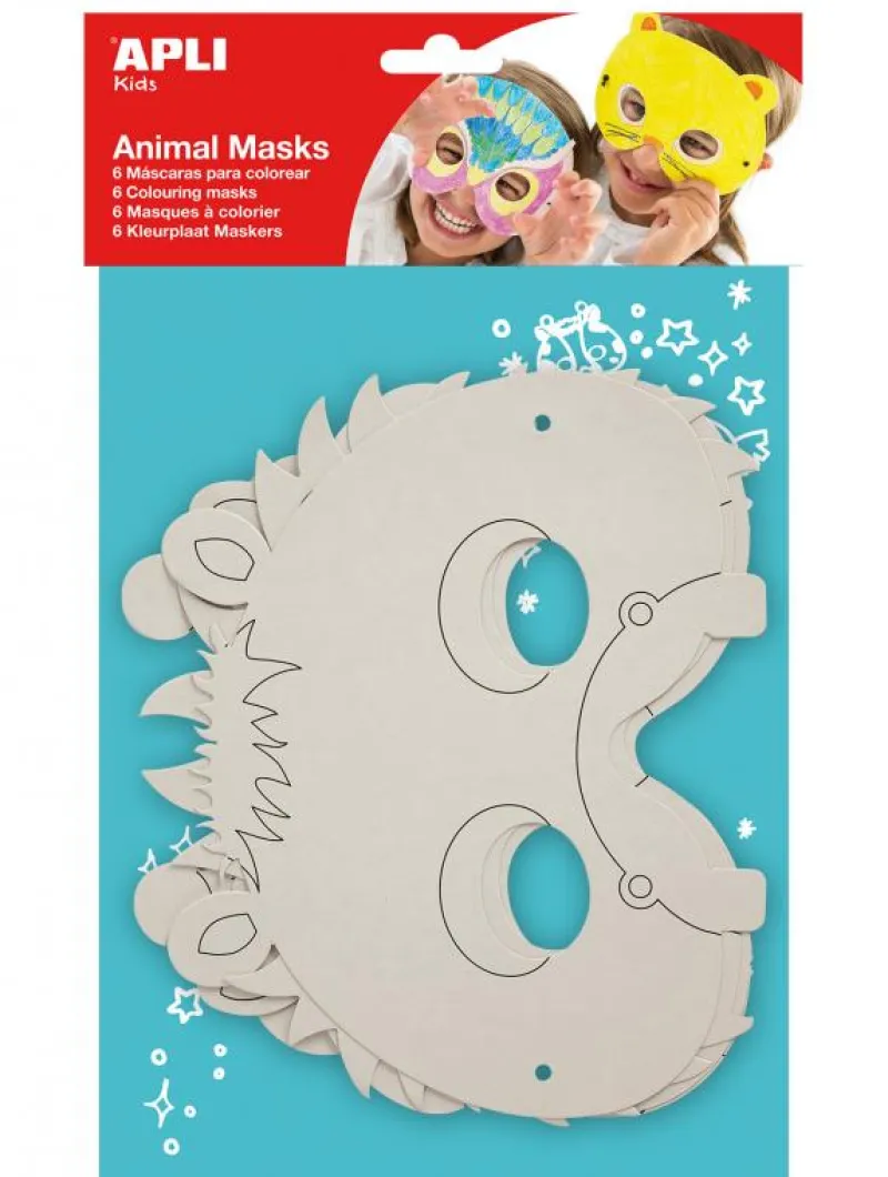 ¡Divertidas mascaras de animales que podrás decorar como más te guste! Conviértete en un animal sigiloso como el gato o, fiero como el león! Bolsa con seis máscaras de animales de cartón para colorear, diseñar y dejar volar la imaginación. Contiene mascaras de: oveja, hipopótamo, jirafa, león, gato y búho. Incluye goma elástica para cada modelo. A partir de 4 años.