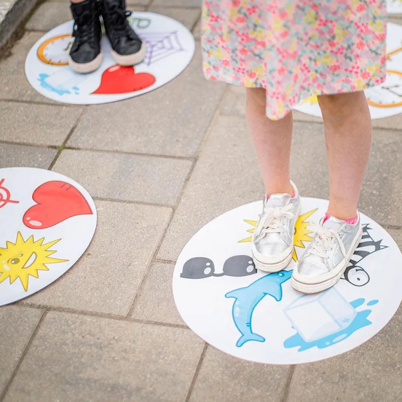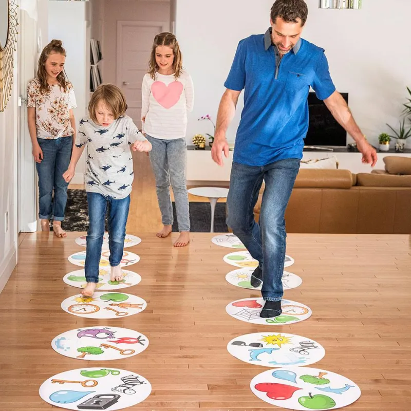 En Dobble XXL, la diversión está en el suelo. Las cartas redondas se presentan en un formato de alfombrillas gigantes, que colocaremos para pisar y saltar ¡una y otra vez! La guía de juego nos presenta cuatro juegos diferentes, en los que la agilidad visual es la protagonista.