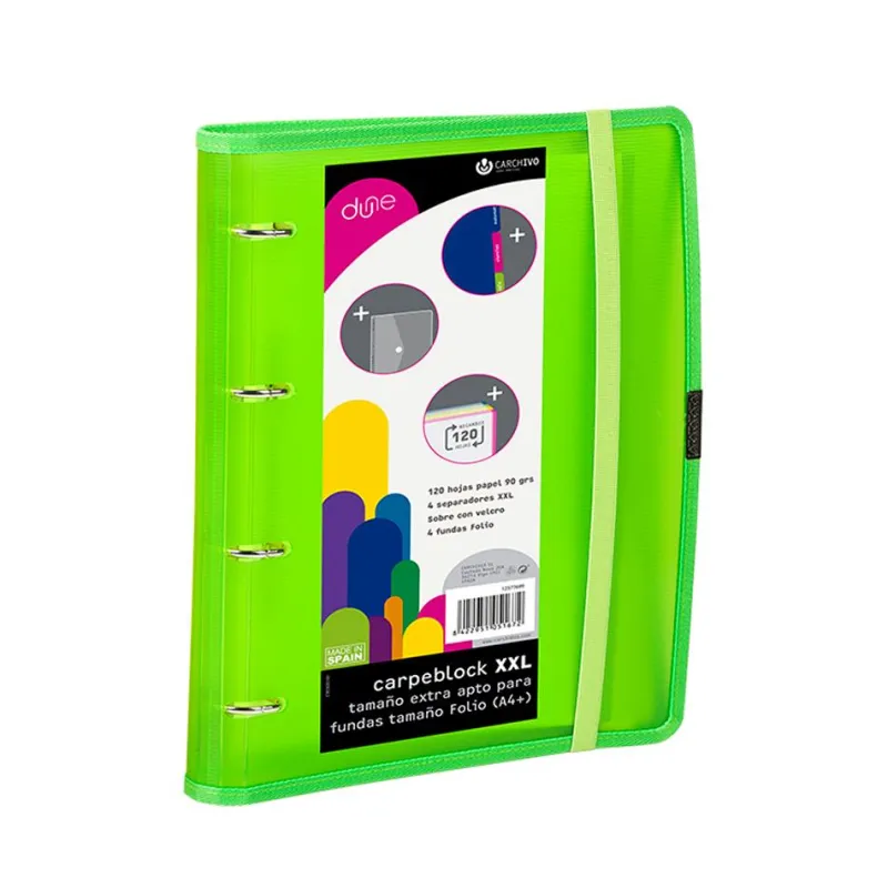 Clasifica y mantén tu apuntes y escritos intactos, con este archivador de color verde tamaño folio de 4 anillas Carchivo con tapas de polipropileno reciclado ¡muy resistente!