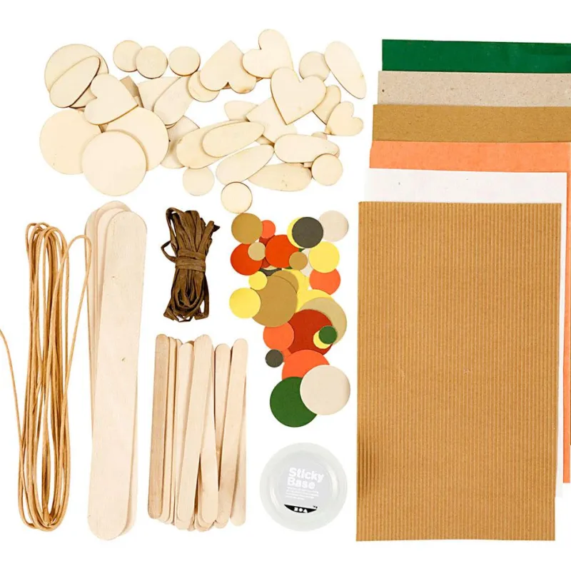 Incluye: sticky base, confeti de papel, cuerda de papel, cartón corrugado, hojas de papel natural, mosaicos de madera, alambre con papel, palos de hielo de madera en diferentes tamaños.