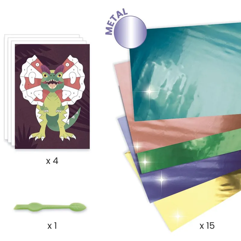 Es una gran actividad manual que los amantes de los dinosaurios disfrutarán. En este estuche encontrarás 4 láminas para decorar. Solo deberás transferir de forma muy sencilla, los distintos tonos de las hojas metalizadas a cada animal según su código de color. Además, el conjunto se presenta en una caja con cierre elástico para guardar los materiales al terminar la actividad. Niños y niñas verán fortalecida su creatividad e imaginación, además de la motricidad fina y la atención.