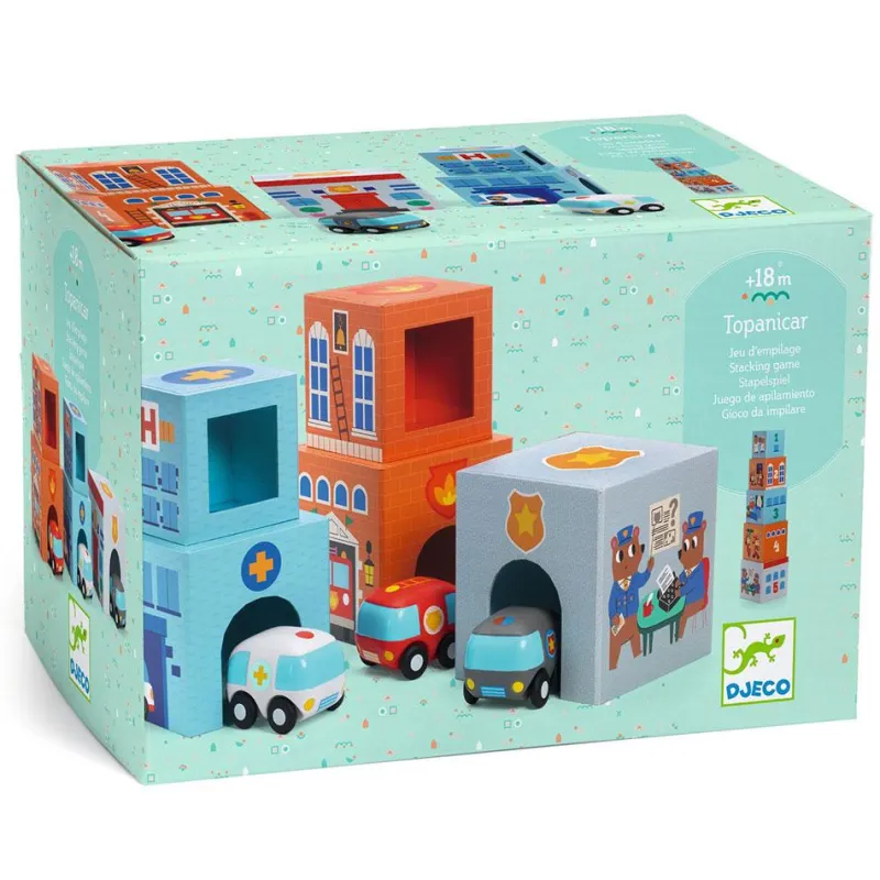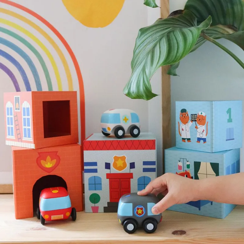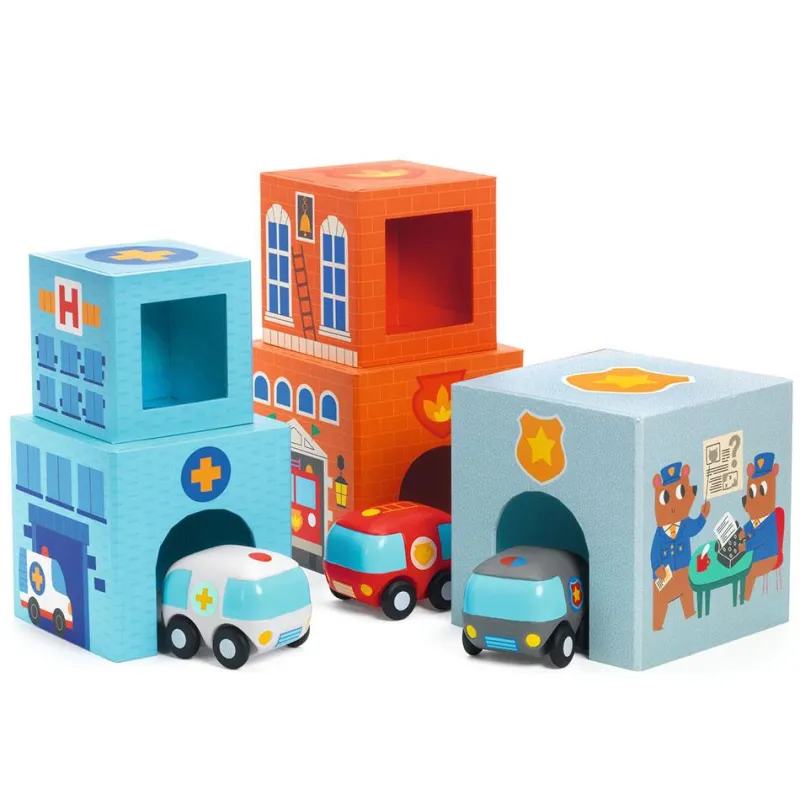 Con este apilable se puede jugar de muchas formas diferentes, promoviendo distintos aspectos del aprendizaje: Colocar uno sobre otro descubriendo diferentes tamaños y colores, construir una torre con todos los cubos para después derribarla, observar las escenas de los cubos, meter y sacar los vehículos de los garajes una y otra vez… Horas de entretenimiento aseguradas.