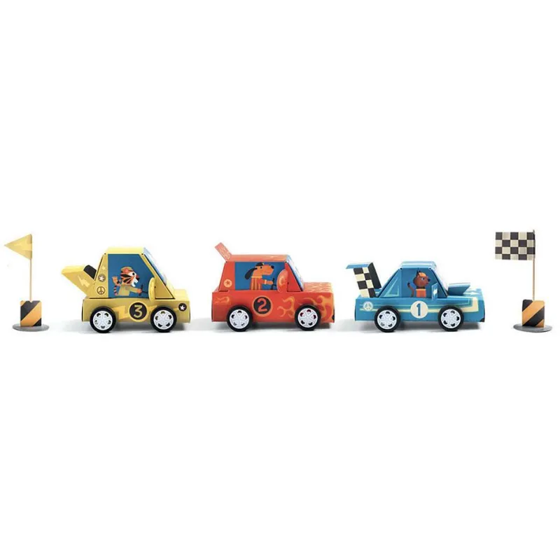 En este kit encontrarás todo lo necesario para montar 3 coches de carreras. Gracias a su sistema de ensamblaje de ruedas, los coches son auténticos juguetes funcionales para seguir jugando sin fin. Decóralos con pegatinas haciendo un diseño único para nuestros simpáticos animalitos corredores. ¡Verás que geniales quedan!