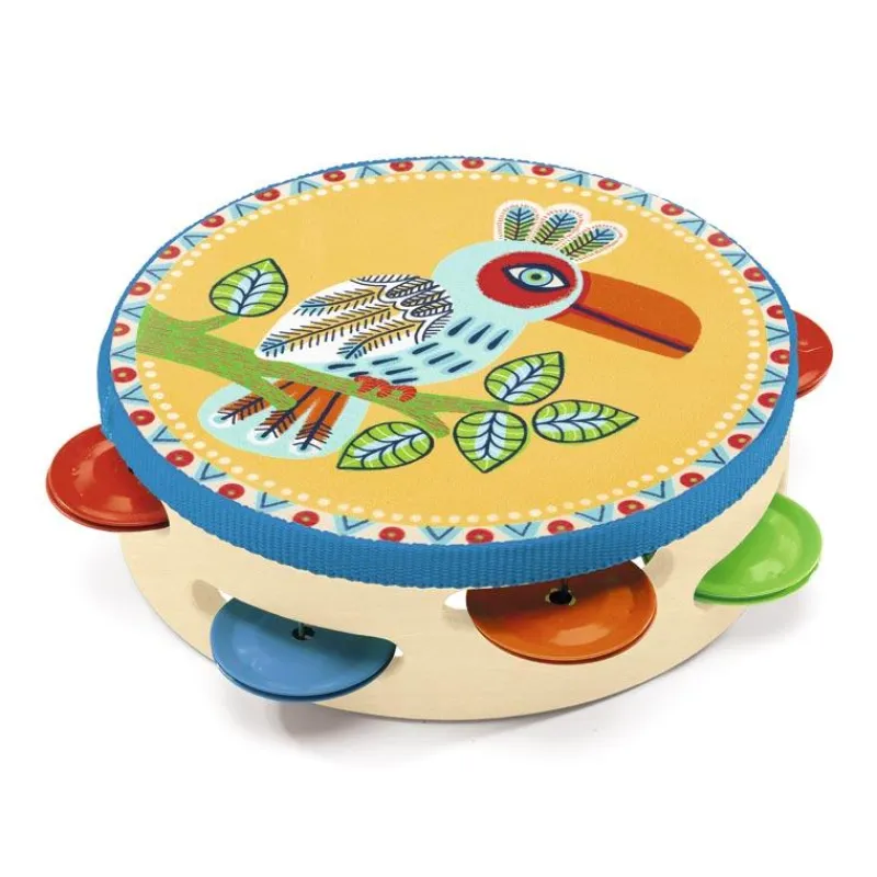 Una pandereta fabricada en madera con colores llamativos y diseño perfecto para pequeñas manos.