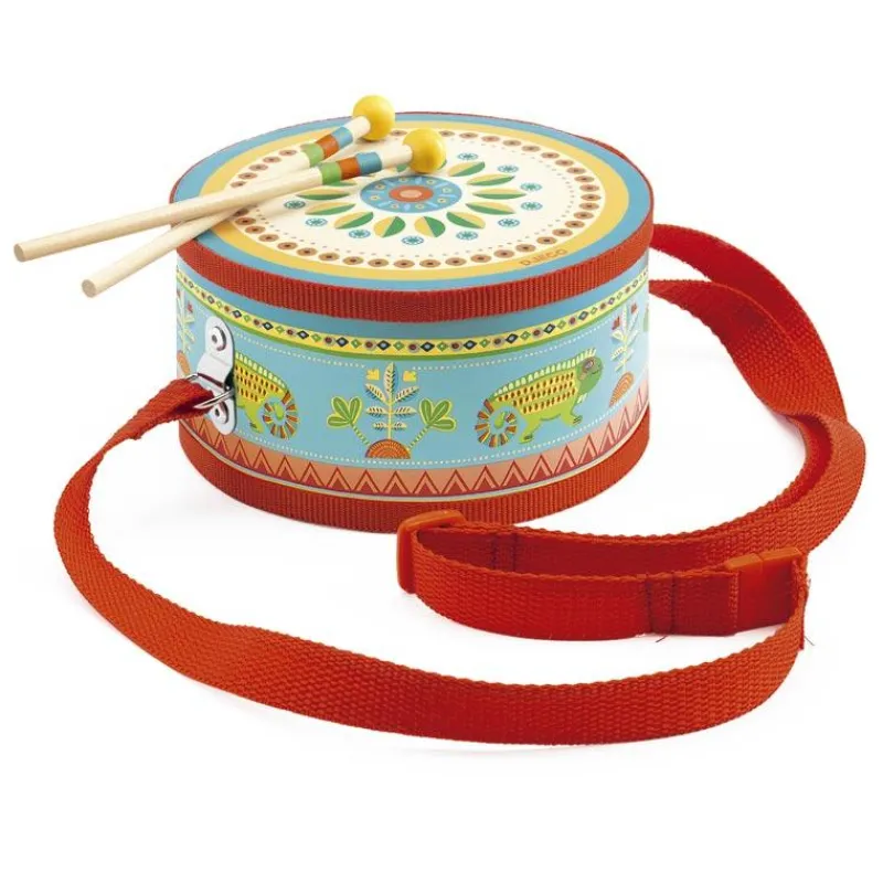 Pequeño tambor de madera con agarres de metal y sonido de gran calidad. En los laterales del tambor, cuelga una pequeña cuerda para poder tocarlo de forma cómoda. ¡Perfecto para manos pequeñas!