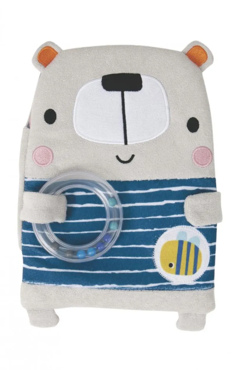 En este libro de cuentos, el osito y el conejito juegan con sus amigos antes de irse a dormir. Un libro de tela y un sonajero para que los bebés observen, toquen y jueguen. También pueden usarlo como peluche.