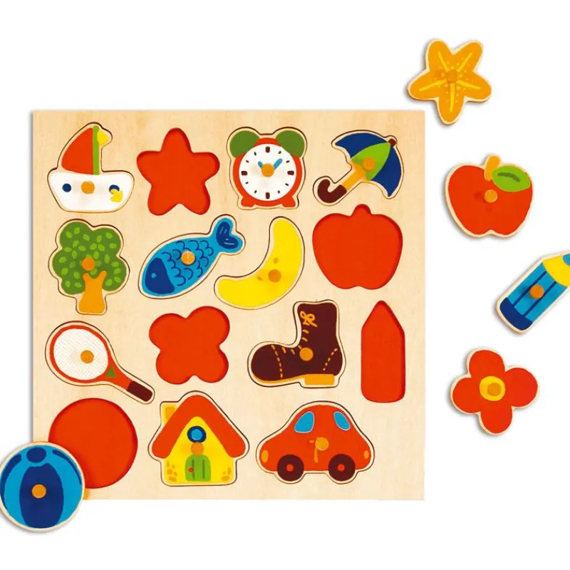 Encajable de quince piezas fabricadas en madera, colores llamativos y listas para encajar asociando las formas. Las piezas disponen de pernos para facilitar el agarre de los más pequeño