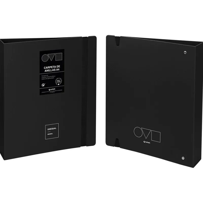 Carpeta A4 con 40 fundas, encuadernada con tapas de polyfoam en color negro. Incluye 4 anillas y cierre con goma elástica.