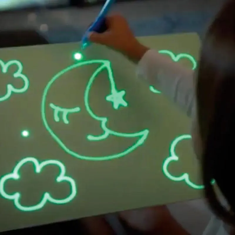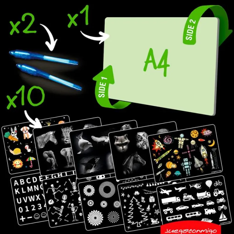 Este fantástico juego te permite plasmar de forma efímera imágenes, letras y dibujos ¡con luz! Se trata de un tablero fotosensible en tamaño A4 y doble cara, sobre el cual podrás crear impresionantes imágenes luminosas a mano alzada o ayudándote del kit de plantillas. Sólo necesitarás hacerte con el bolígrafo luminoso, y que el entorno esté lo menos iluminado posible: cuanto más tenue sea la iluminación, mayor intensidad y duración tendrán los dibujos que realices. Si la oscuridad es total, ¡tu dibujo será visible durante más de 20 minutos!