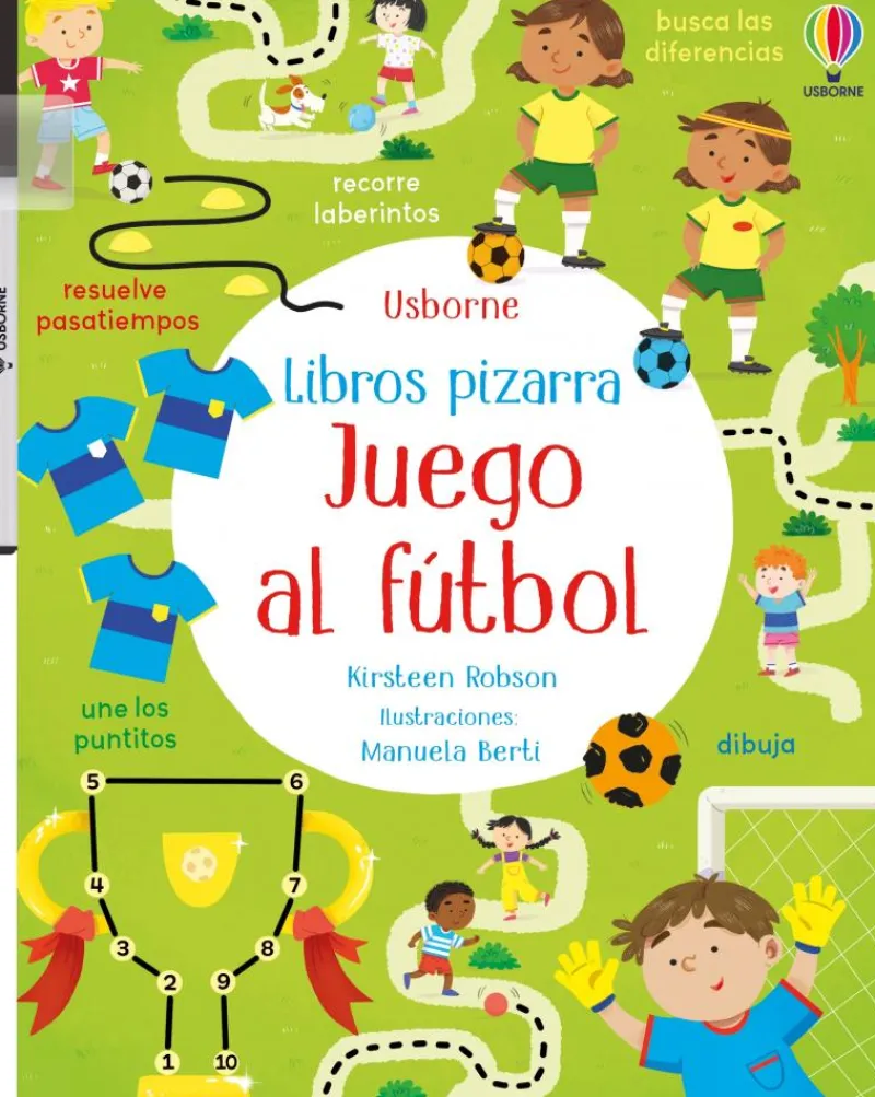 Libro pizarra para los más pequeñines con un montón de actividades inspiradas en el fútbol. Los niños se divertirán durante horas con pasatiempos variados que incluyen laberintos, unir los puntitos, buscar las diferencias, contar objetos y dibujos sencillos. Además, los pasatiempos les ayudarán a mejorar el control del lápiz. Incluye rotulador con tinta borrable, para que puedan repetir las actividades tantas veces como quieran.