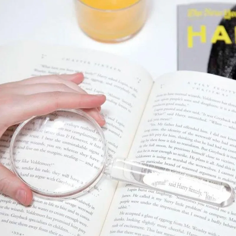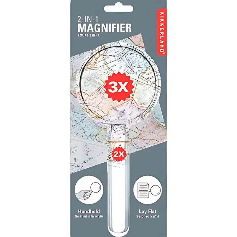 El cristal redondo tiene una lupa de 3 aumentos, y el mango tiene una lupa de 2 aumentos. La forma alargada del cristal del mango hace que sea muy útil para leer texto.