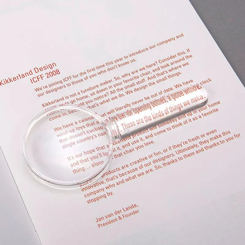 El cristal redondo de esta lupa en tamaño de bolsillo tiene una lupa de 3 aumentos, y el mango tiene una lupa de 2 aumentos. La forma alargada del cristal del mango hace que sea muy útil para leer texto.
