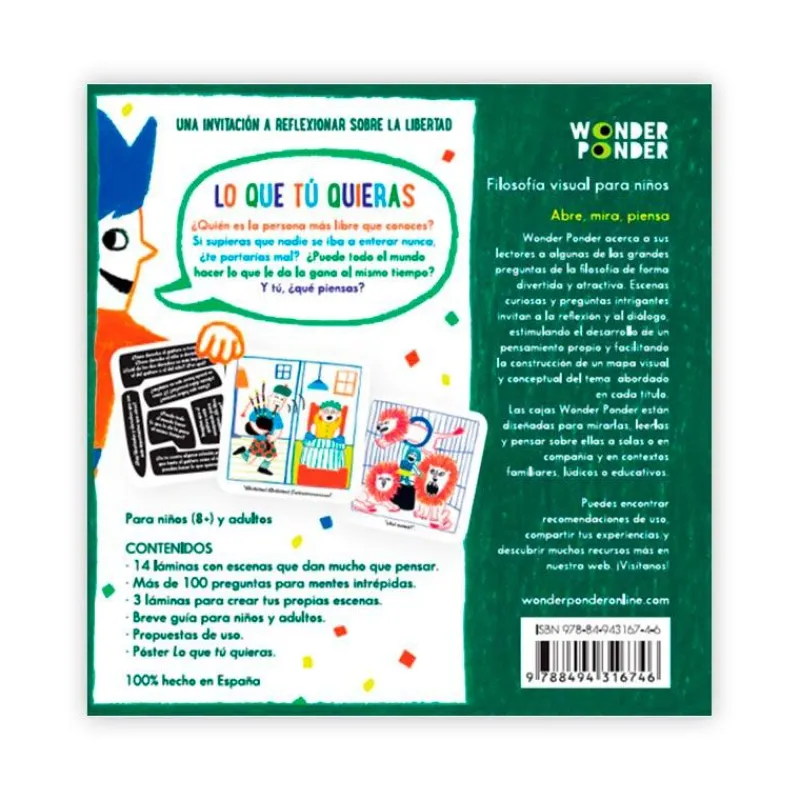 ¿Quién es la persona más libre que conoces? Si supieras que nadie se iba a enterar nunca, ¿te portarías mal? ¿Puede todo el mundo hacer lo que le da la gana al mismo tiempo? ¿Y tú, qué piensas?Lo que tú quieras es un libro-juego presentado dentro de una caja que indaga sobre la libertad y sus distintos matices con humor, intriga, rigor y cuidado.El sello Wonder Ponder acerca a sus lectores a algunas de las grandes preguntas de la filosofía de forma divertida y atractiva. Escenas curiosas y preguntas intrigantes invitan a la reflexión y al diálogo, estimulando el desarrollo de un pensamiento propio y facilitando la construcción de un mapa visual y conceptual del tema abordado en cada título.Para leerse a solas o en compañía, las cajas Wonder ponder están diseñadas para mirarlas, leerlas y pensar sobre ellas en contextos familiares, lúdicos o educativos.