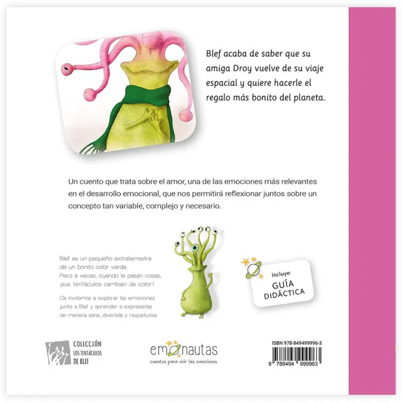 Blef acaba de saber que su amiga Droy vuelve de su viaje espacial y quiere hacerle el regalo más bonito del planeta. Un cuento que trata sobre el amor, una de las emociones más relevantes en el desarrollo emocional, que nos permitirá reflexionar juntos sobre un concepto tan variable, complejo y necesario.