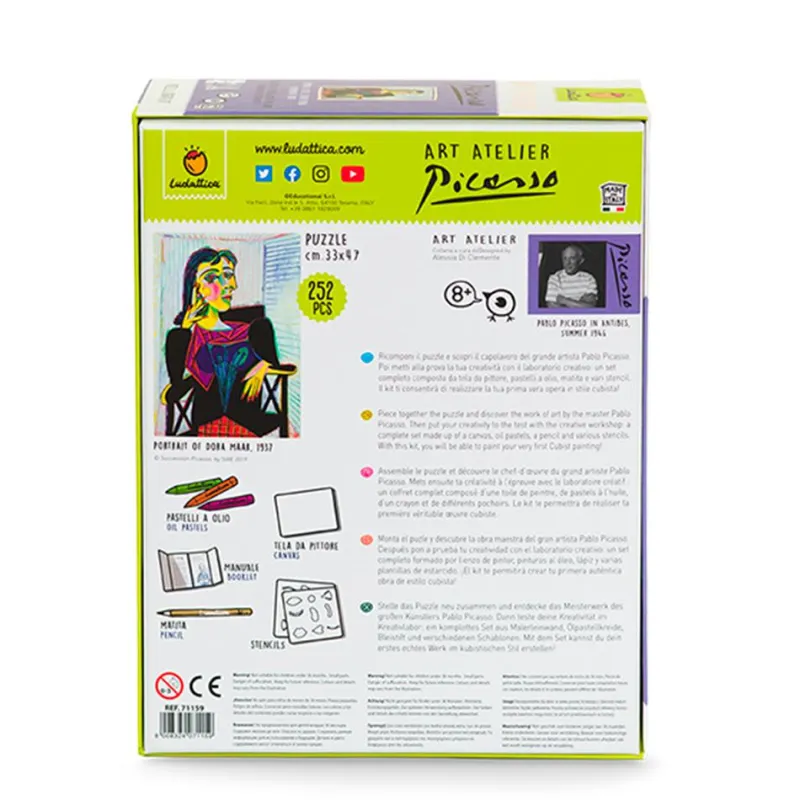 En esta alucinante escuela de pintura, ¡Picasso será tu maestro! Construye el rompecabezas de la obra de arte «Retrato de Dora Maar» y después pon a prueba tu creatividad en el Taller de pintura Cubista. Un conjunto completo compuesto por bastidor con lienzo, pintura al temple y pincel. Este kit te permitirá crear una pintura de estilo Cubista -estilo que él mismo inventó-, ¡perfecta para colgar en tu habitación!