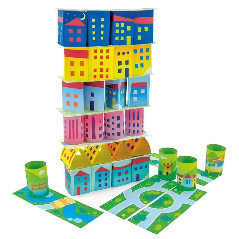 Este fantástico set rebosa creatividad: las piezas de papel son muy resistentes, y vienen preparadas para que puedas ensamblarlas, creando así todos los bloques que luego agruparás para dar forma a tu ciudad.