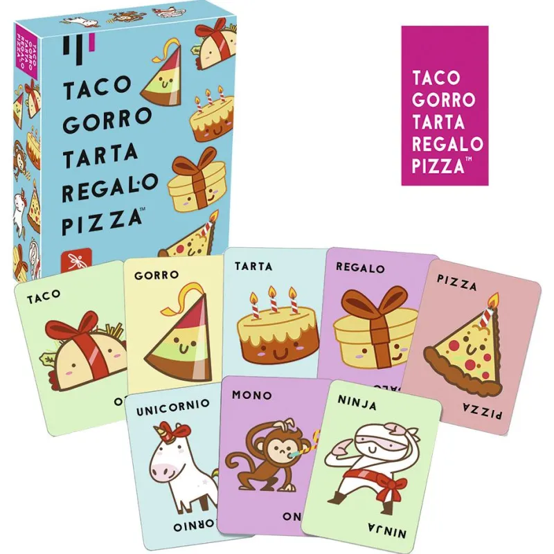 Taco, Gato, Cabra, Queso, Pizza nos encantó, y su versión posterior nos fascinó. Ahora, la nueva versión Taco, Gorro, Tarta, Regalo, Pizza nos ha conquistado de nuevo y los fanáticos de esta divertidas serie no podemos esperar a tenerlo en las manos, ¡prepárate para controlar tus nervios y ser el más rápido de reflejos en este juego, un auténtico trabalenguas para el cerebro! Un juego en el que la rapidez visual, la asociación, la memoria y los reflejos serán claves para ayudarte a ganar la partida. Esta nueva versión incluye nuevas cartas con nuevas premisas, añadiendo emoción y más posibilidades de juego, ¡mézclalas con las versiones anteriores para multiplica