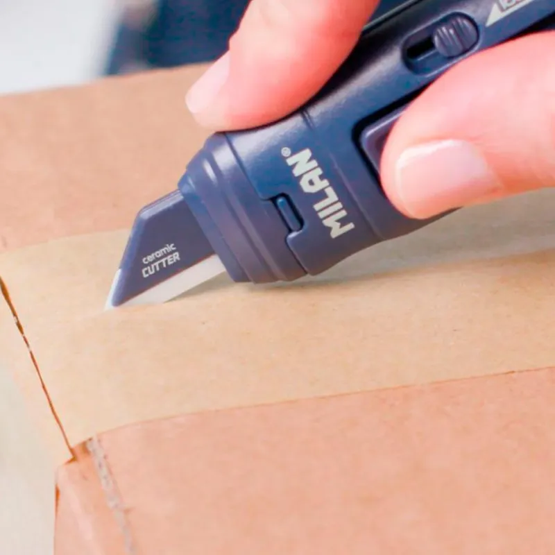 Cúter con hoja de cerámica, diseño serie 1918 Milan en color azul marino, tamaño pequeño tipo bolsillo, botón deslizador con dos posiciones y cuchilla con protector y sistema de bloqueo de seguridad.