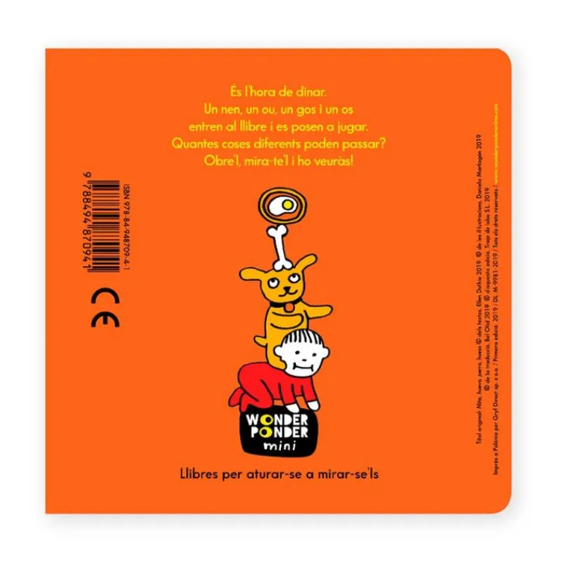 És l’hora de dinar.Un nen, un ou, un gos i un osentren al llibre i es posen a jugar.Quantes coses diferents poden passar?Obre?l, mira-te?l i ho veuràs!TEMES: hora de menjar / gossos / cucutràs /lògica / alfabetització visual / diferències /canvis / sorpreses / joc simbòlic