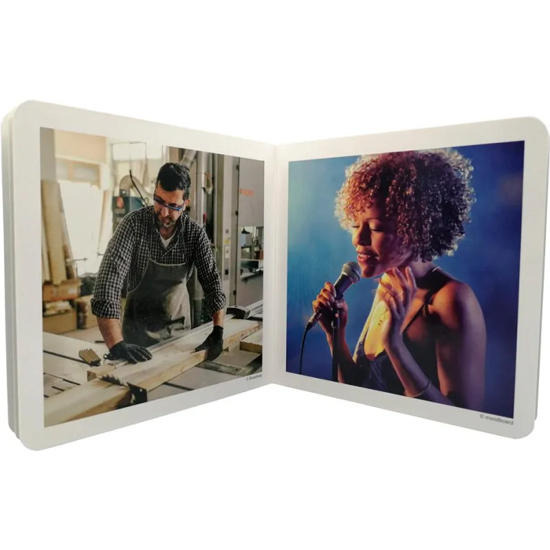 Libro de fotografías con algunas de las profesiones más habituales. Se incluyen diez fotografías de: médica (portada), pastor, pintora artística, trabajadora de la construcción, agricultor, carpintero, cantante, fontanero, profesor, cocinera y frutero.