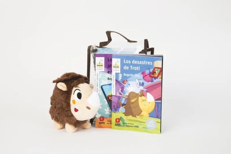 Un pack con los dos primeros títulos de la colección Troti y los Mug: Los desastres de Troti y Los Mug, atrapados en el móvil , y además, un muñeco de Troti, la mascota que siempre acompaña a los Mug y a Mía en todas sus aventuras.