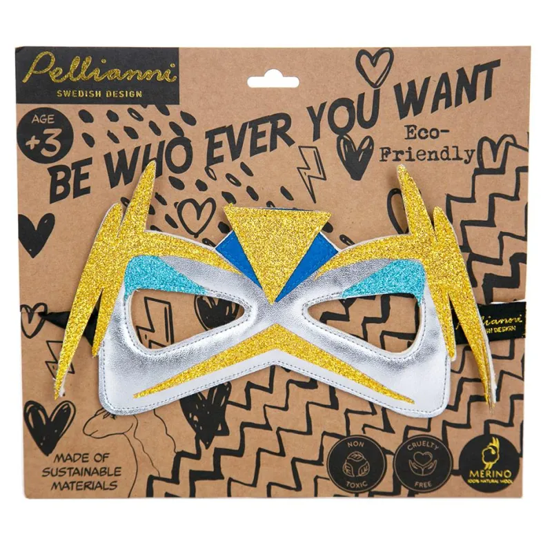 ¡Este antifaz nos ha conquistado! Es flexible pero resistente, con un diseño llamativo y centrado en la comodidad de los niños y niñas que quieran convertirse en los superhéroes más divertidos. Está realizado con piel vegana, lana merina australiana natural y no tóxica, y con purpurina testada y segura para el medioambiente. En la parte trasera dispone de un elástico de goma ajustable que asegura la máxima comodidad.