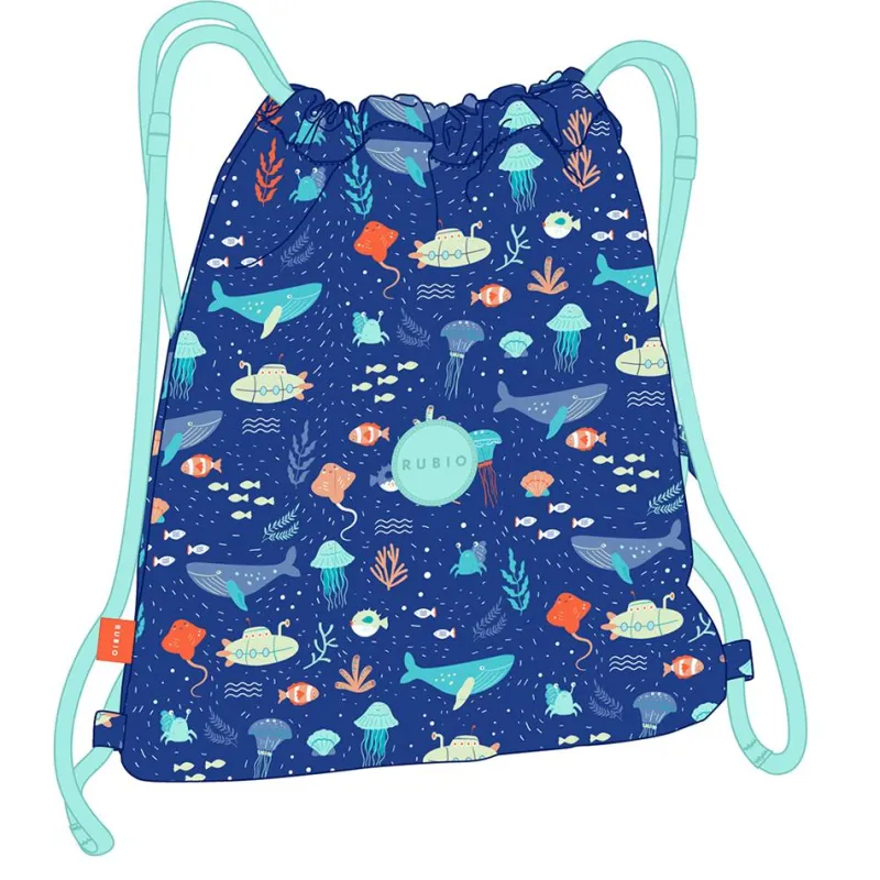 Lleva todo lo necesario en esta genial mochila saco con estampado inspirado en el mundo marino sobre fondo azul, ¡es perfecta para llevar a mano todas tus cosas!