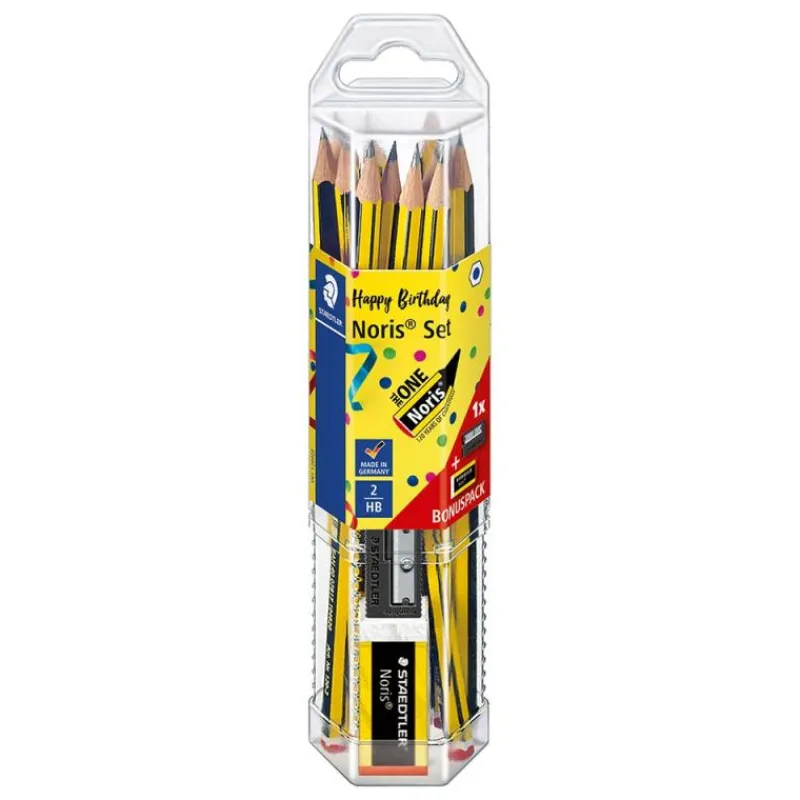 El set contiene 12 lápices Noris HB, 1 goma de borrar Mars plastic y 1 afilalápiz.
