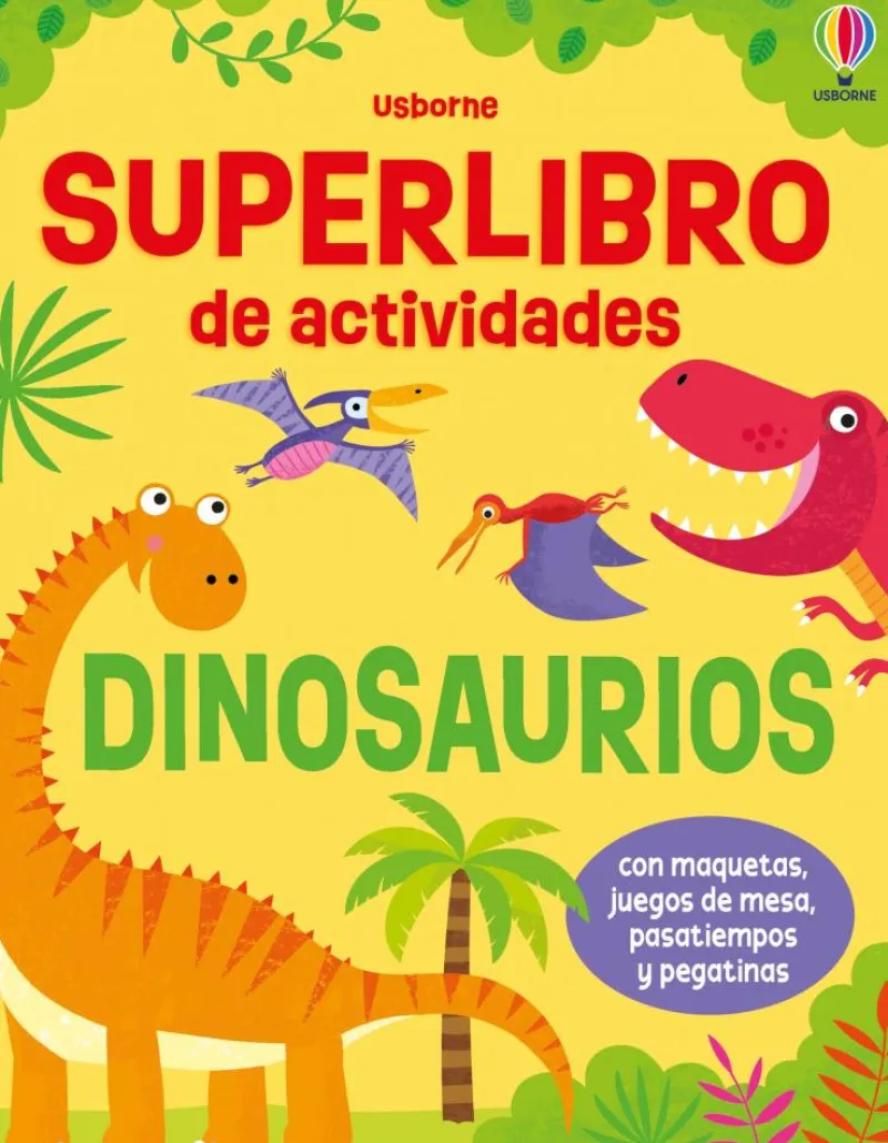 Gran libro ilustrado de actividades que incluye maquetas, juegos de mesa, pasatiempos y pegatinas. Los niños podrán emparejar objetos, buscar las diferencias o unir los puntos. También hay escenas para colorear y completar con las pegatinas, un rompecabezas de doble cara y dos juegos de dominó, además de ocho páginas con piezas recortables que se separan presionando con la mano para construir sus propios dinosaurios de cartón y marionetas de dedo.