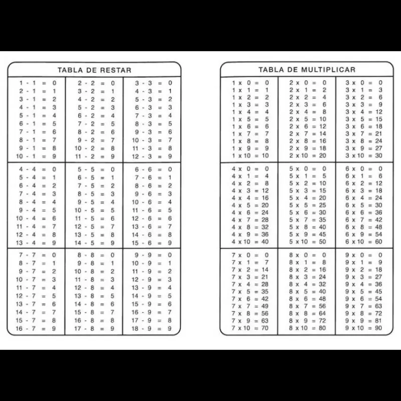 Cartulina con las tablas de las operaciones de sumar, restar, multiplicar y dividir.