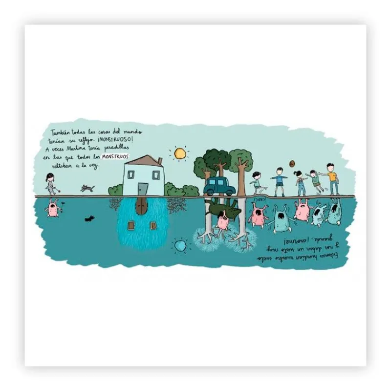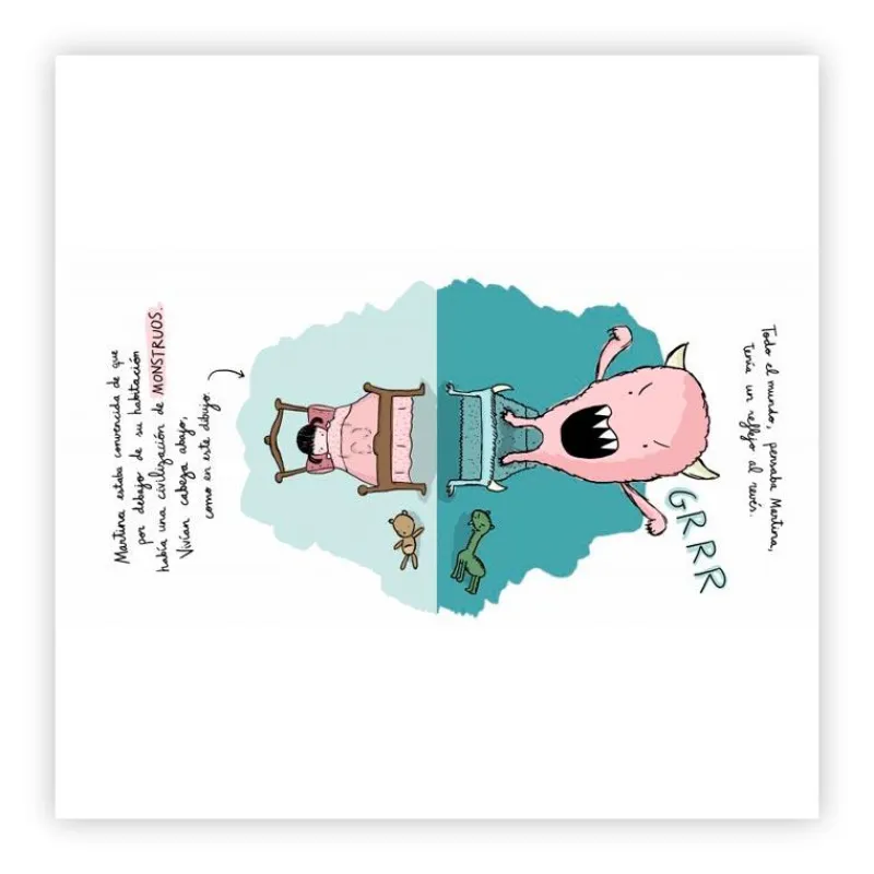 Martina tiene miedo por las noches. Sabía que cuando saliera la luna la mandarían a la cama. ¡Nadie, menos ella, escuchaba al monstruo! Martina piensa que debajo del suelo de su habitación se esconde un mundo habitado por monstruos que caminan con la cabeza hacia abajo. ¿Qué pasaría si la frontera entre ambos mundo se rompiera? ¡Vamos a descubrirlo!